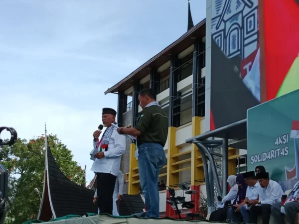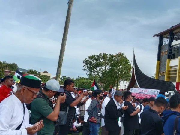 Ribuan warga turun berjalan damai menyuarakan kemerdekaan palestina dari Masjid Raya Sumbar menuju kantor Gubernur Sumatera Barat, Minggu (4/5/2025) Oktavia Ramadhani.Peserta aksi juga ikut menandatangani petisi yang berisi beberapa tuntutan, Minggu (4/5/2025) Nabilla Kurnia Putri.Suasana khusyuk massa aksi solidaritas Palestina saat melaksanakan sholat zuhur berjamaah di halaman kantor gubernur Sumbar, Minggu (4/5/2025) Oktavia Ramadhani. Aksi teatrikal penyiksaan terhadap warga Gaza diperagakan dalam aksi solidaritas untuk Palestina di dekat kantor gubernur Sumbar, Minggu (4/5/2025) Oktavia RamadhaniKorlap aksi solidaritas Palestina menyerukan dukungan kemanusiaan untuk rakyat Palestina saat orasi di depan peserta aksi di halaman Kantor Gubernur Sumbar, Minggu (4/5/2025) Oktavia RamadhaniGubernur Sumatera Barat menyuarakan dukungan bagi rakyat Palestina dalam aksi solidaritas yang digelar di halaman Kantor Gubernur Sumbar, Minggu (4/5/2025) Oktavia RamadhaniTokoh Sumbar menyuarakan dukungan penuh untuk Palestina dalam pembacaan pernyataan sikap di halaman Kantor Gubernur Sumbar, Minggu (4/5/2025) Oktavia RamadhaniDoa bersama digelar di akhir aksi solidaritas sebagai bentuk dukungan moral terhadap perjuangan rakyat Palestina, Minggu (4/5/2025) Nabilla Kurnia Putri