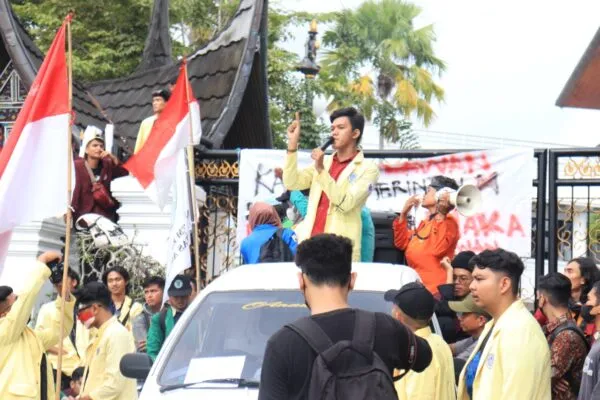Padang, gentaandalas.com- Aliansi Badan Eksekutif Mahasiswa Sumatra Barat (BEM-SB) menggelar aksi tuntut pemerintah turunkan harga Bahan Bakar Minyak (BBM) di depan Gedung DPRD Sumatra Barat (Sumbar), Rabu (7/9/2022). Aksi ini melibatkan lebih dari seribu mahasiswa dari berbagai universitas di Sumbar yang turun langsung ke jalan untuk menyuarakan tuntutan mereka. Selain mahasiswa, berbagai kalangan seperti volunteer, siswa sekolah, hingga masyarakat turut serta pada aksi tersebut.