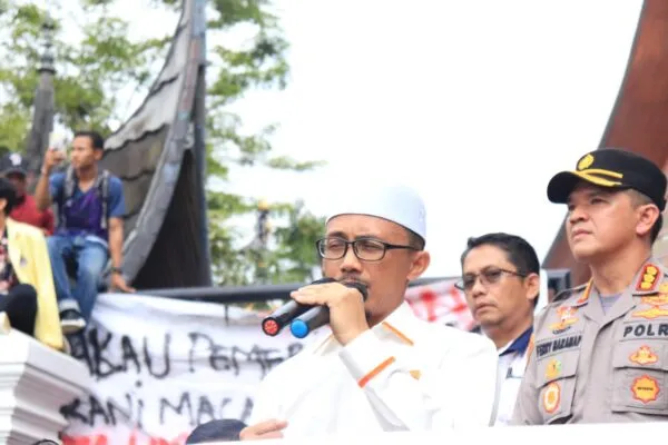 Wakil ketua I DPRD, Irsyad Syafar turun mewakili Ketua DPRD Sumatera Barat menemui massa aksi mengumumkan hasil keputusan di depan Gedung DPRD Sumatera Barat, Rabu (7/9/2022). (Genta Andalas/Fatiza Khaira)