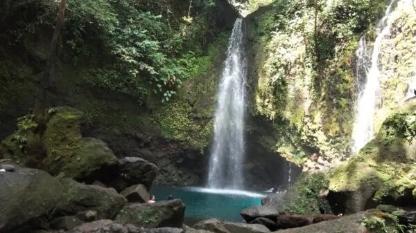 Setelah melewati jalanan setapak, sesampaikan di lokasi air terjun, maka akan terdengar suara aliran air terjun yang jatuh. Udara dingin dan percikan air terjun yang segar mampu menambah kesejukan dan keelokan akan tempat ini. Tidak hanya satu air terjun yang terdapat di lokasi, melainkan terdapat tiga buah air terjun yang jatuh dan berkumpul di satu kolam air berwarna biru kehijauan yang memanjakan mata.